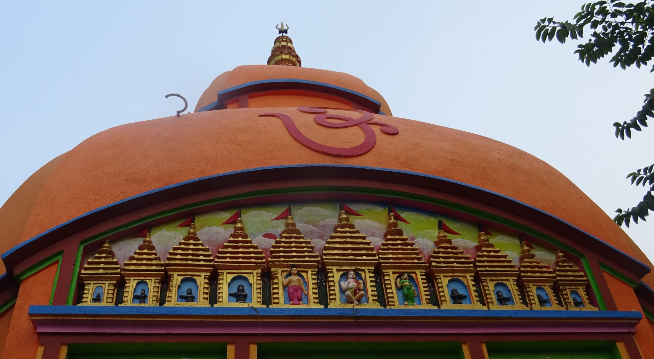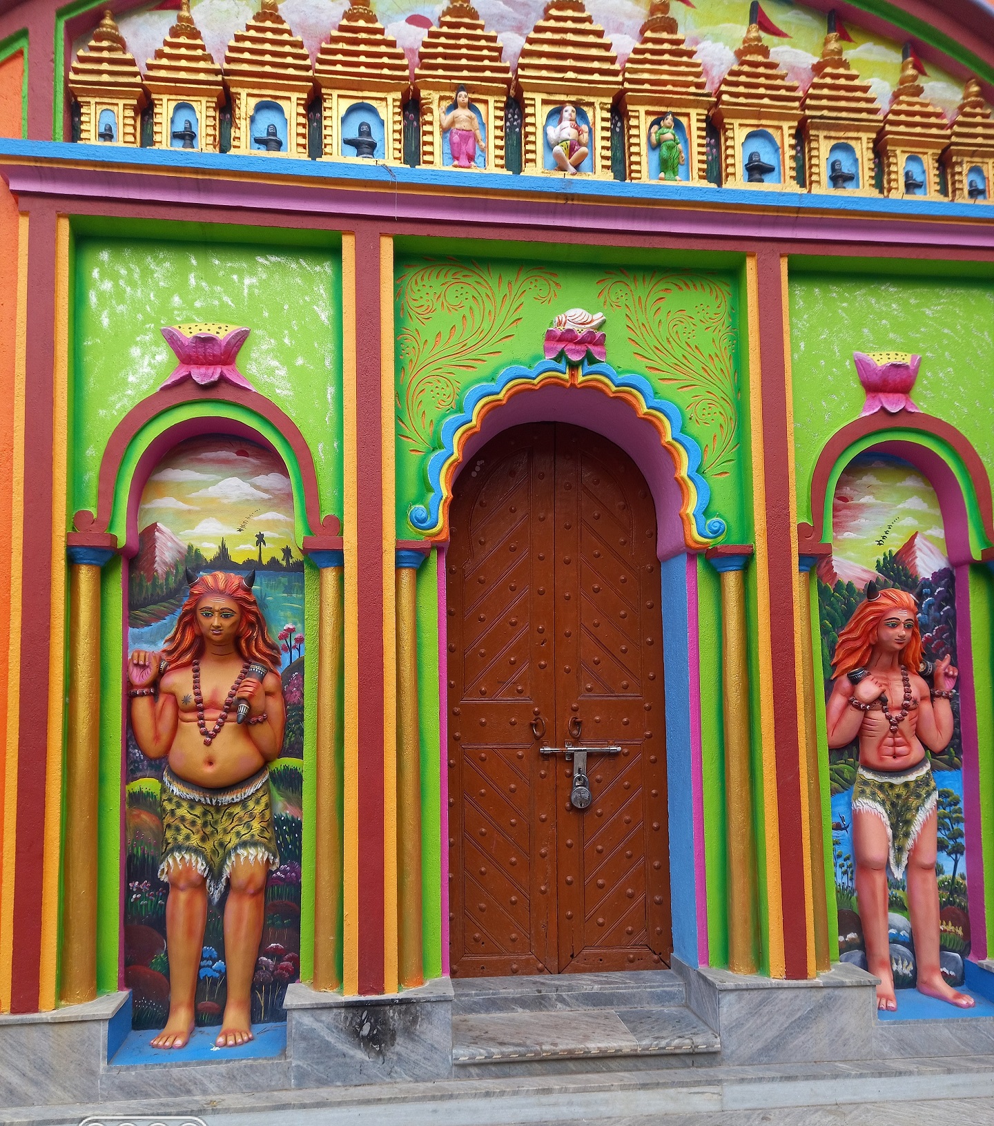 The front wall of the temple has a row of carved, pirah-shaped deuls. However, since they have all been repainted, the terracotta beauty has been lost.